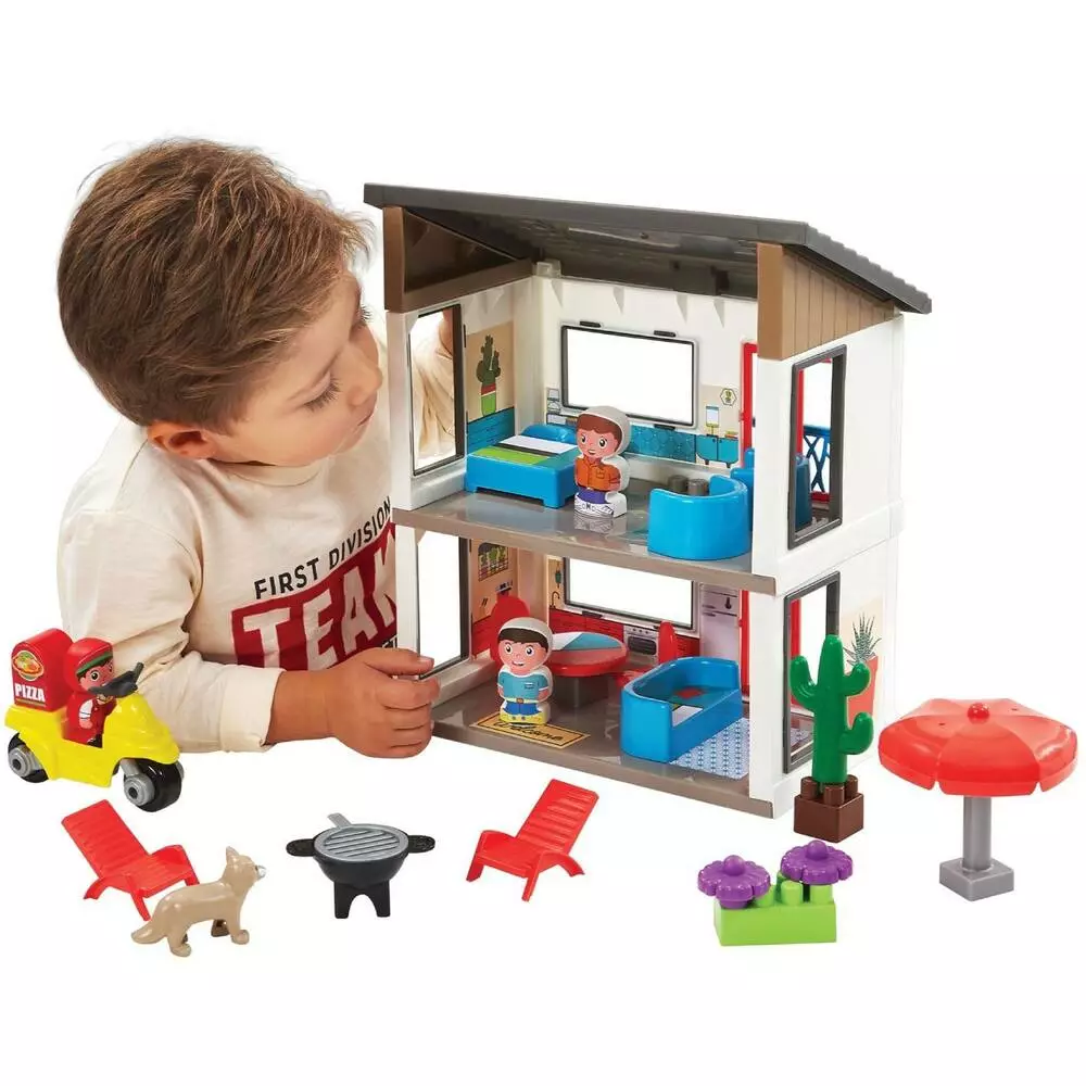 Au rez-de-chaussĂ©e, 1 cuisine et 1 salon, Ă l’Ă©tage, 1 chambre. Avec 3 personnages, 1 chien et des accessoires.
