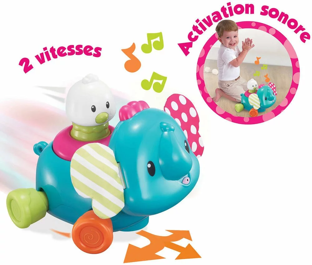 Les mélodies et sons joués par le petit éléphanteau, quand il avance et quand on appuie dessus, encouragent l’enfant à le suivre, développant ainsi son ouïe, sa motricité globale et son appréhension de l’espace. Le produit parle en français et fonctionne avec des piles (non fournies).