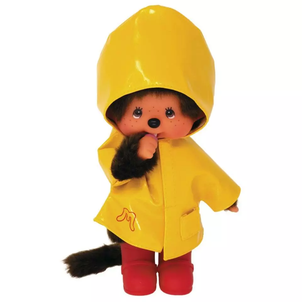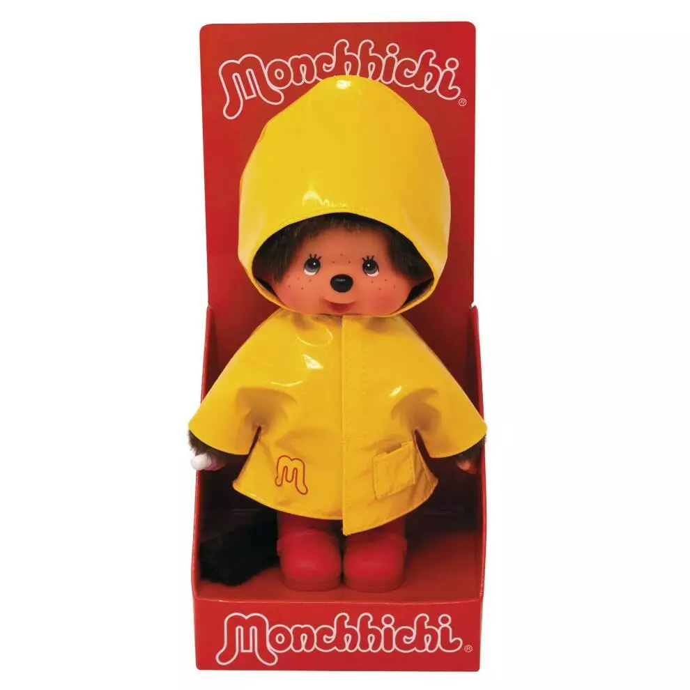 Monchhichi est prêt à affronter la pluie avec son ciré jaune et ses belles bottes ! ll n’a pas peur de la pluie… Il nous fait craquer !! peluche 26 cm.