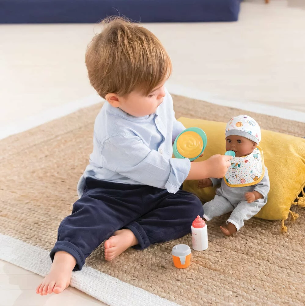 Miam, c’est l’heure du repas ! Ce coffret contient les accessoires indispensables pour le repas des petits poupons : une cuillère, une assiette de purée, un gobelet de jus d’orange, un biberon et un bavoir.