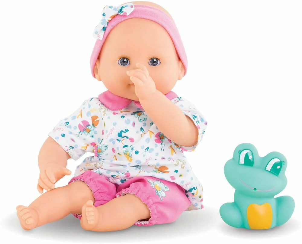 dans le bain (eau savonneuse) à la piscine (eau chlorée) et à la mer (eau salée). L’attache cousue dans son dos permet de le suspendre pour le faire sécher après le bain et les jeux d’eau. Il mesure 30cm; la taille parfaitement adaptée aux petits bras et mains de l’enfant pour le manipuler. Son corps souple lui permet de prendre les mêmes positions qu’un vrai bébé. Son visage; ses bras et ses jambes; à la délicate senteur de vanille; sont en vinyle doux au toucher. Son pouce peut se maintenir dans sa bouche. Avec ses yeux dormeurs; il fait dodo quand on le couche sur le dos. Il est habillé d’une blouse & d’un short et coiffé d’un bandeau assorti. Il est livré avec une grenouille de bain qui crache de l’eau quand on appuie dessus après l’avoir immergée. Bébé Bain Océane dispose d’une collection variée de vêtements et d’accessoires dans la gamme mon premier poupon Corolle pour pouponner pour la première fois.