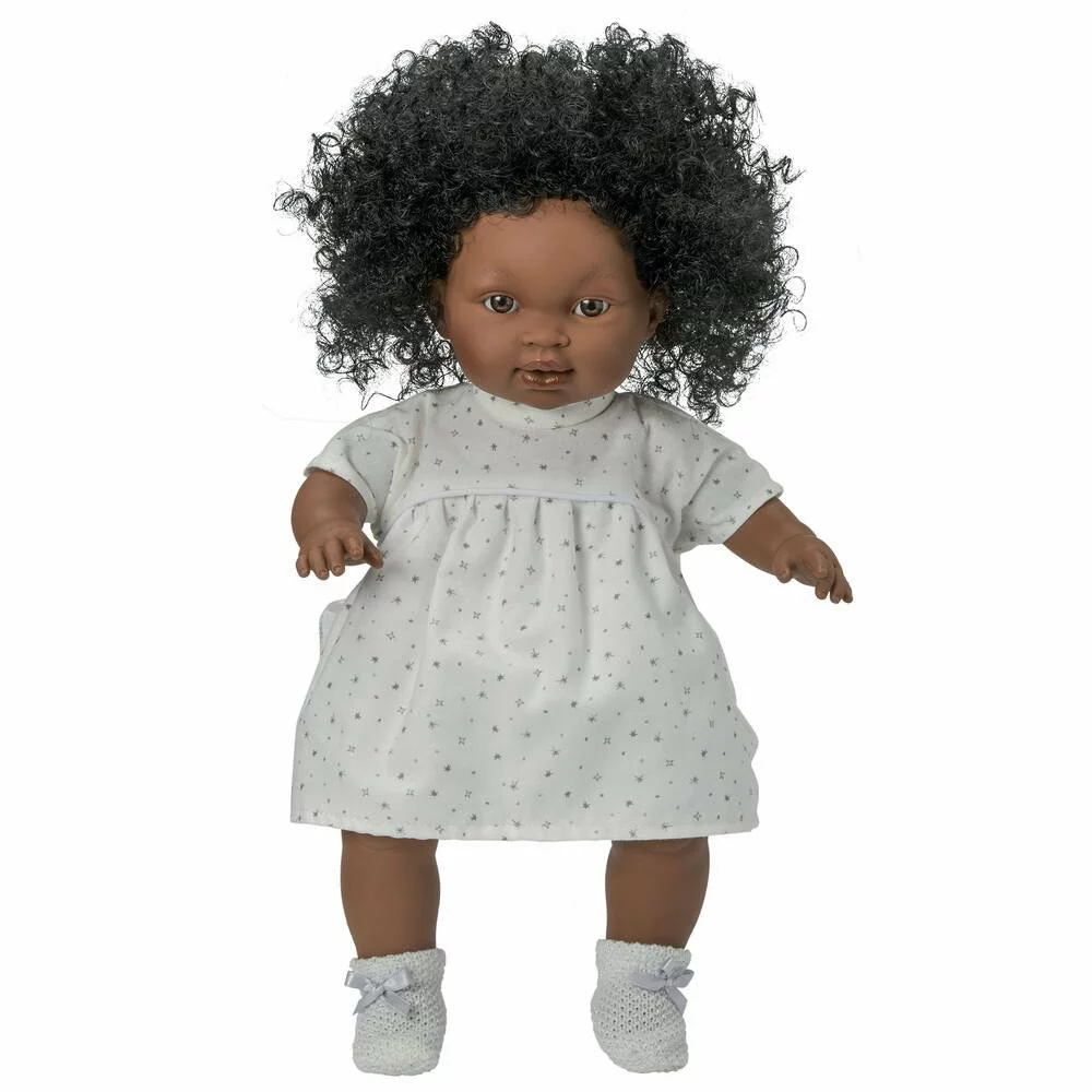 Poupée de 38 cm. Au corps souple. Cheveux très réalistes. Elle porte une robe, une culotte et des chaussons en tissu.