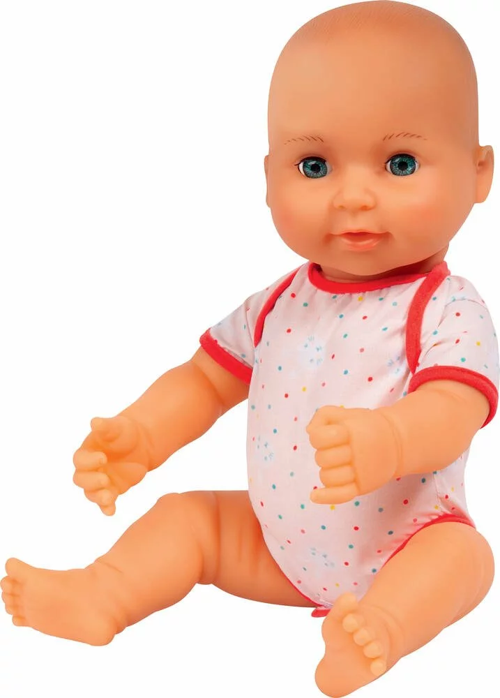 Poupée de 40 cm qui boit et fait pipi. Set composé d’une tétine, une cuillère, une fourchette, une assiette, deux couches, un biberon et un pot. Tu peux la mettre dans la baignoire car elle est waterproof.