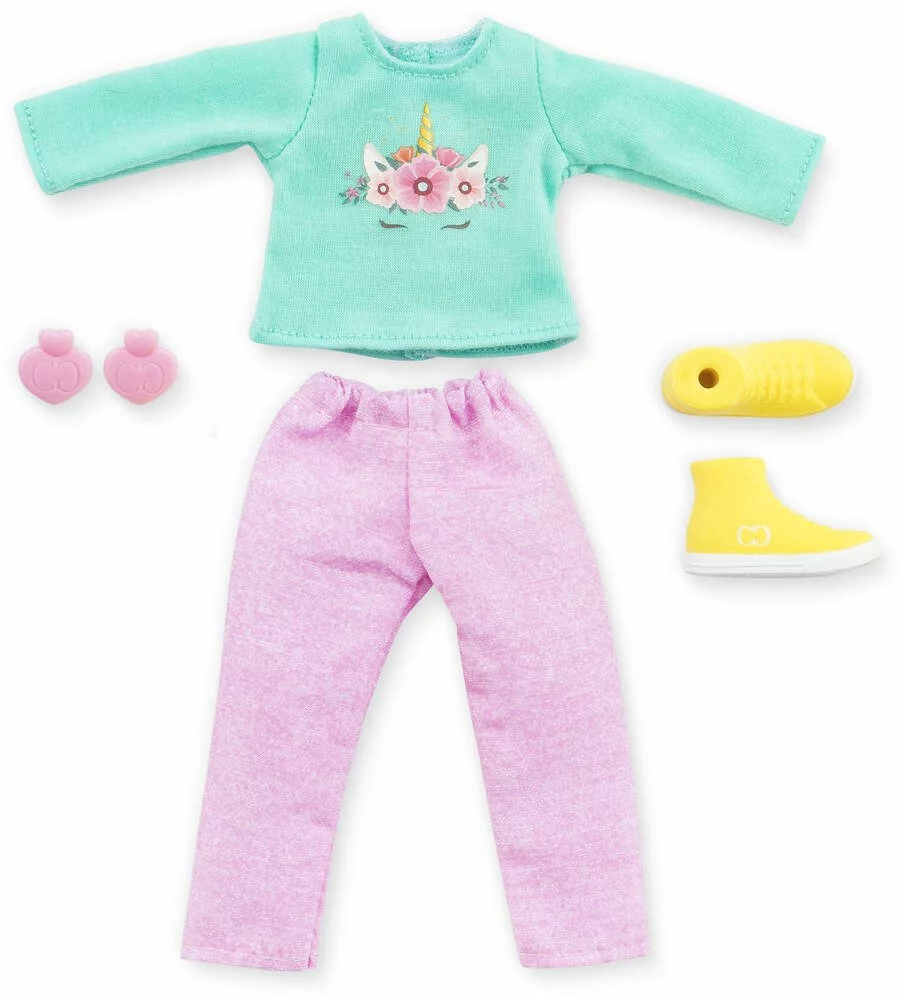 Luna a un joli visage naturel aux traits fins qui sent bon la vanille. Ses yeux sont peints et elle possède de longs cheveux bruns. Elle porte 1 pantalon rose, 1 T-Shirt manches longues imprimé, 1 paire de bottines amovibles et 1 paire de boucles d’oreille amovibles.