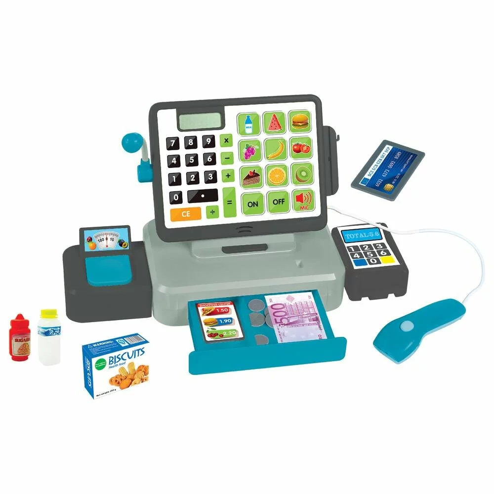 Caisse enregistreuse électronique avec 20 accessoires dont : 1 carte de crédit, 1 carte du magasin, de l’argent factice (8 pièces et 7 billet), 2 bouteilles et 1 boîte de biscuits (marchandises factices). Fonctions de la caisse enregistreuse : vraie calculatrice, scanner avec sons et lumière, et un micro qui fonctionne réellement. La caisse enregistreuse a une balance, un terminal de paiement et un tiroir-caisse. Permet à l’enfant de se familiariser avec les principales opérations mathématiques (addition, soustraction, multiplication, division), tout en s’amusant.