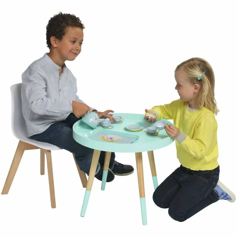 Set de 15 pièces en métal dont un plateau, un théière avec couvercle, 4 assiettes, 4 tasses et 4 sous-tasses.