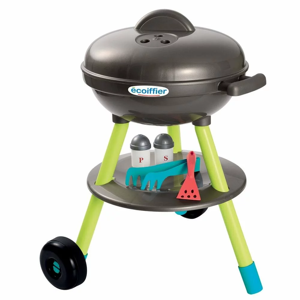 Un barbecue version grise roulant avec plein d’accessoires: 6 morceaux de charbon, une grille, une salière, une poivrière, une pince, une spatule, 2 saucisses, 2 tomates et 1 poulet.