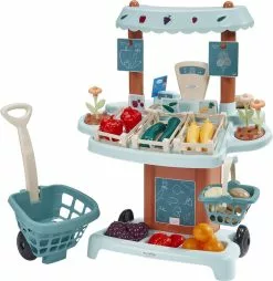 Marchande roulante agrémentée de 41 accessoires dont 1 balance, 1 terminal de paiement, des pièces de monnaie, 1 panier, 1 chariot, des cagettes, des fleurs, des fruits et des légumes.