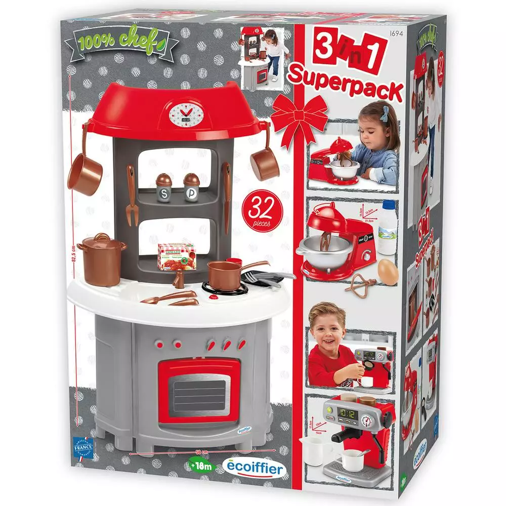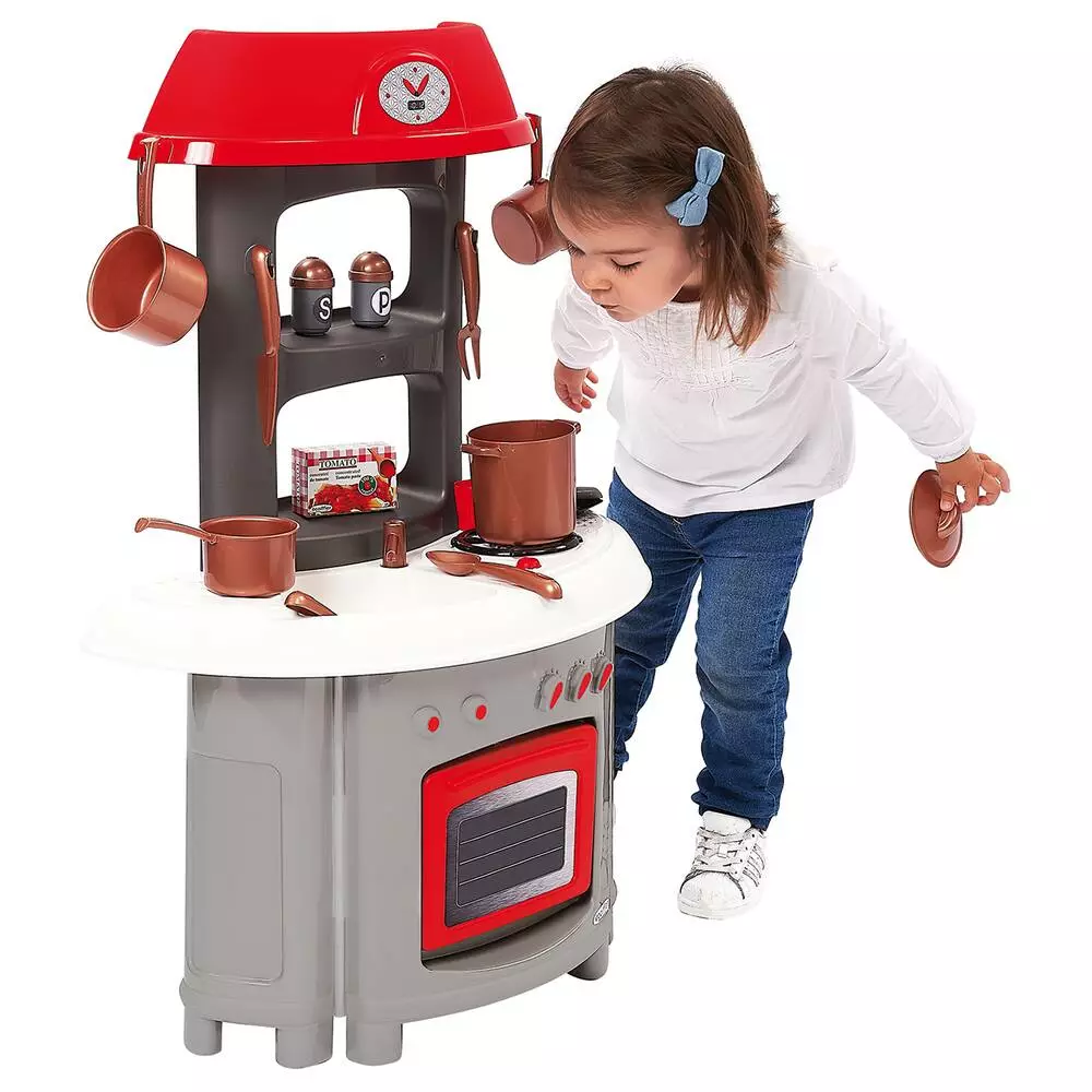 Avec évier, four, casseroles, marmite, robot, percolateur et de nombreux accessoires.