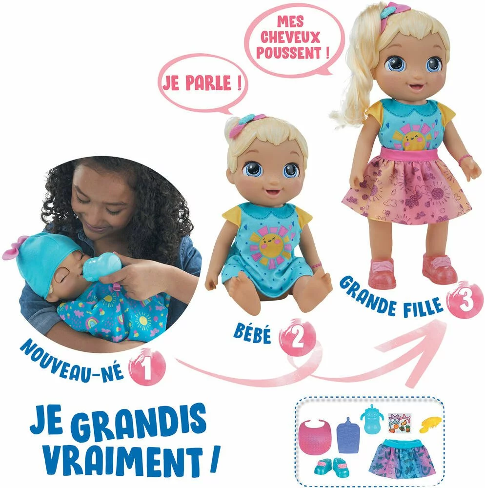 Cette poupée grandit vraiment de nouveau-né à petite fille, si on prend soin d’elle ! Interactive, elle bouge, et son langage évolue en fonction de « son âge ! Une poupée incroyable ! Poupée surprise modèle selon disponibilité. Accessoires inclus.