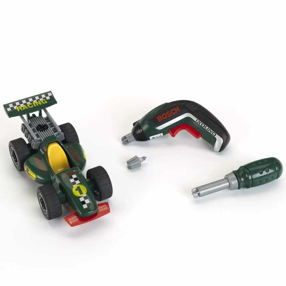 Cette mallette « Grand Prix » BOSCH contient une sublime voiture de course en pièces détachées ! Munis-toi de ton tournevis ou de ta visseuse afin de donner naissance à un véritable bolide taillé pour la course ! Ta visseuse possède des fonctions électroniques réalistes : bruitage, rotation G/D, embouts interchangeables. Véhicule entièrement montable et démontable. Livré avec un jeu de stickers. Construis ton véhicule de course et remporte le Grand Prix ! Effets sonores et lumineux.