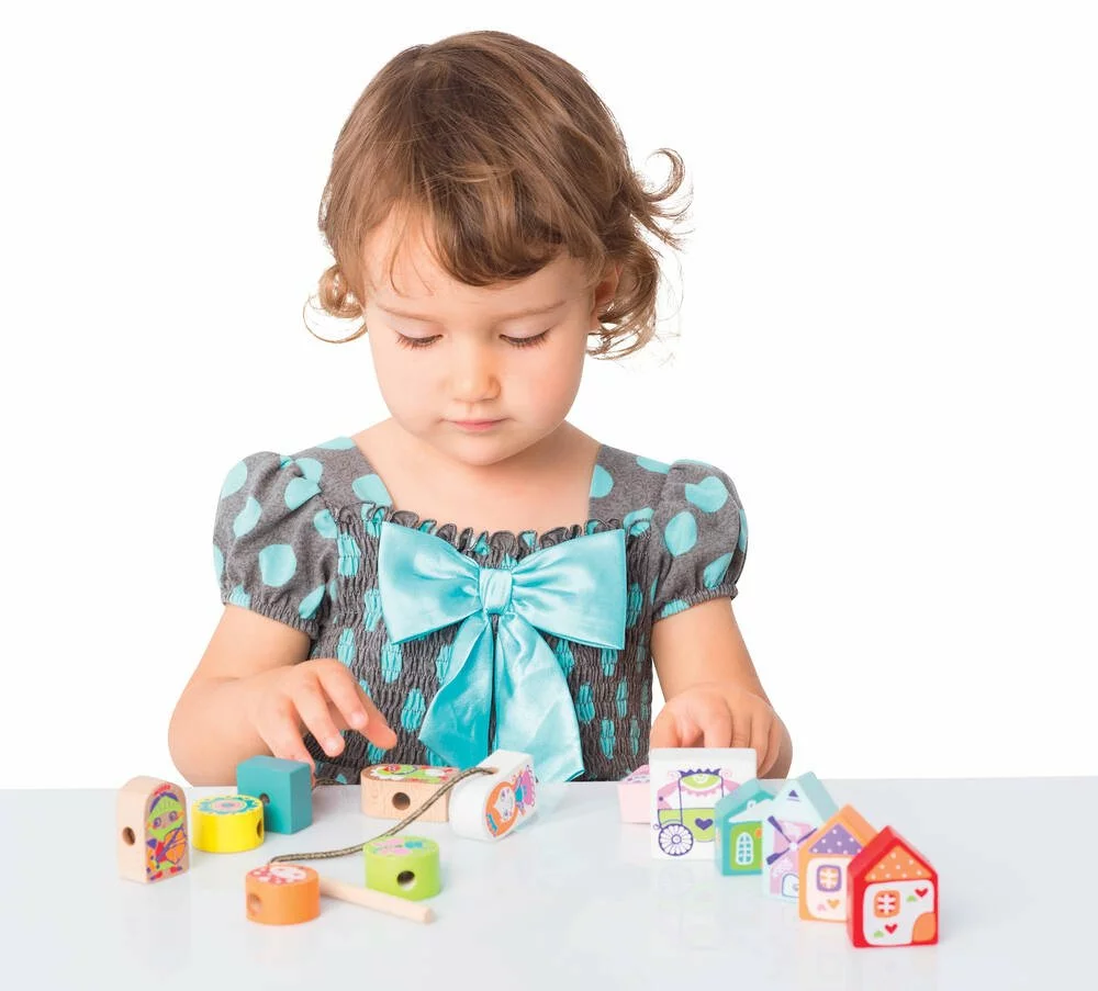 12 blocs en bois à enfiler sur une cordelette à l’aide d’une longue aiguille en bois. Les blocs sont ornés de divers personnages de contes de fées tels que princesse, chevalier, dragon, carrosse… 8 cartes fournies pour indiquer à l’enfant différentes séquences pour enfiler les éléments. Les blocs peuvent aussi être utiliser séparément. En bois : hêtre et sycomore. Permet de se familiariser avec les formes et de découvrir les couleurs. Développe la motricité fine et le raisonnement logique. Livré en boîte couleur. Produit en bois certifié.