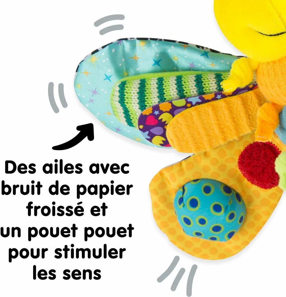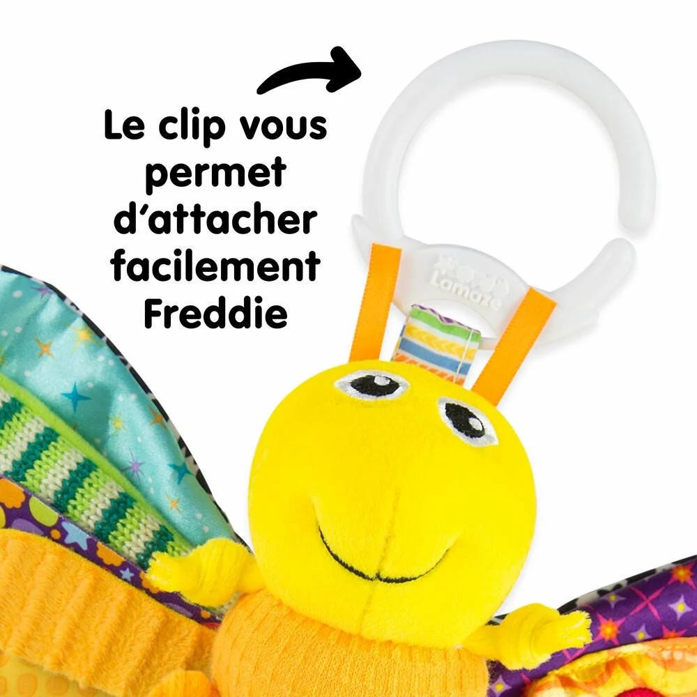 Freddie offre à votre petit enfant toutes les activités nécessaires à son éveil : il froisse ses ailes, fait tinter le grelot, se regarde dans le miroir, mordille l’anneau à dentition. Les ailes de Freddie la Luciole cachent un miroir, un anneau de dentition, des bruits rigolos… Avec son attache Clip’n Go pour accompagner Bébé partout.