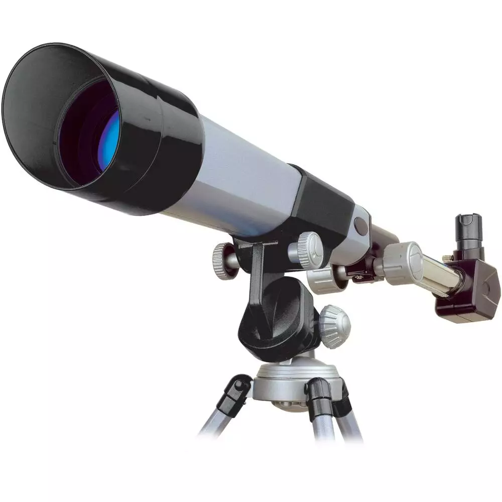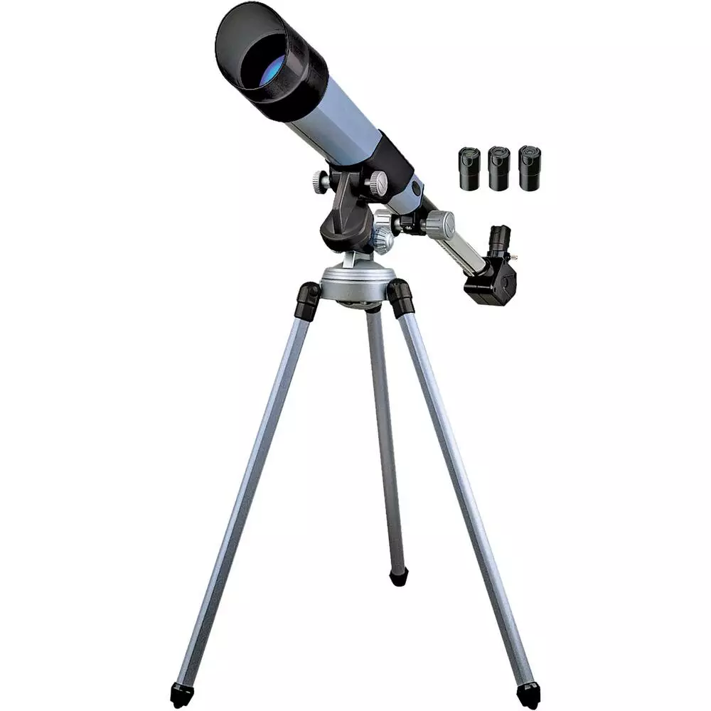 Télescope astronomique avec trépied métallique. Avec 3 oculaires interchangeables 25 mm, 12.5 mm, 8.3 mm, soit des puissances de 20x, 40x, 60x. Diamètre de l’objectif : 50 mm. Longueur focale : 500 mm. Miroir diagonal. Découvre l’astronomie avec ce télescope perfectionnant. Manuel d’instructions.