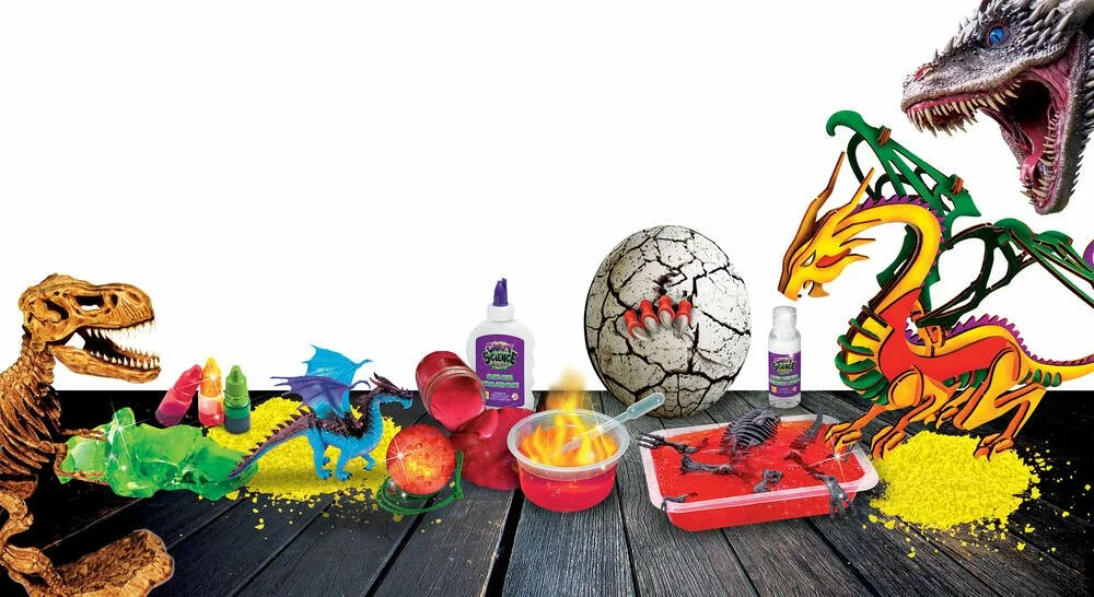 Dragons mythologiques, dinosaures mammouths… ces créatures fantastiques et ces animaux vraiment existants coexistent dans ce kit scientifique rempli de boue de feu, d’œufs à creuser et de dinosaures à construire! Avec le kit Dragons et dinosaures de la gamme Crazy Science, vous avez tout ce dont vous avez besoin pour explorer et comparer ces deux mondes de créatures grandioses. Cet atelier est vraiment fougueux, commencez à créer une amulette pleine de bavures de dragon enflammées, construisez votre propre dragon et dinosaure et découvrez les autres surprises passionnantes! Kit scientifique rempli de slime de feu, d’œufs à creuser et de dinosaures à construire ! Accessoires inclus.!