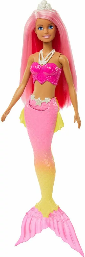 Plongez dans de nouvelles aventures avec les poupées sirènes du royaume de Barbie Dreamtopia ! Cette Barbie sirène affiche un look royal aux couleurs de l’arc-en-ciel propice aux aventures sous-marines : un corsage inspiré de coquillages et une queue à joli dégradé multicolore. Une merveilleuse chevelure rose et un diadème royal viennent compléter sa tenue aux touches marines. Grâce à l’articulation au niveau de la taille, cette Barbie sirène peut « nager » dans l’océan ou s’asseoir pour se prélasser au soleil ! Avec tant de tenues multicolores et de détails fantastiques qui les transforment en créatures magiques, les poupées sirènes Barbie Dreamtopia inspireront plein d’histoires formidables aux enfants à partir de 3 ans. Chaque poupée est vendue séparément. Certains produits peuvent ne pas être commercialisés. La poupée ne peut pas nager ou tenir debout toute seule. Les couleurs et les décorations peuvent varier.