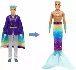 Avec sa cape royale qui se transforme en queue de sirène étincelante, ce Ken Dreamtopia peut devenir prince ou créature sous-marine magique en quelques secondes. Il suffit d’enlever son costume royal et sa cape et de la retourner, révélant ainsi une queue de triton arc-en-ciel à paillettes. Remettez-la ensuite sur la poupée pour un look totalement différent ! Fourni avec 1 couronne, 2 manchettes et 1 collier d’inspiration marine. (La poupée ne peut pas nager).