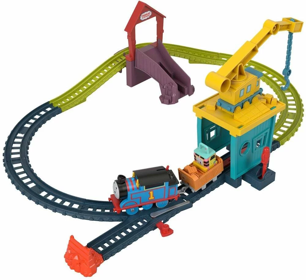 Circuit et train motorisé avec wagon tirés de la série. Circuit interconnectable et compatible avec l’ensemble de la gamme à l’échelle. Action manuelle à faire et refaire. 1 moteur Thomas motorisé, Carly la Grue, Sandy le Rail Speeder™, 8 rails. Interconnectable. 1 véhicule inclus.