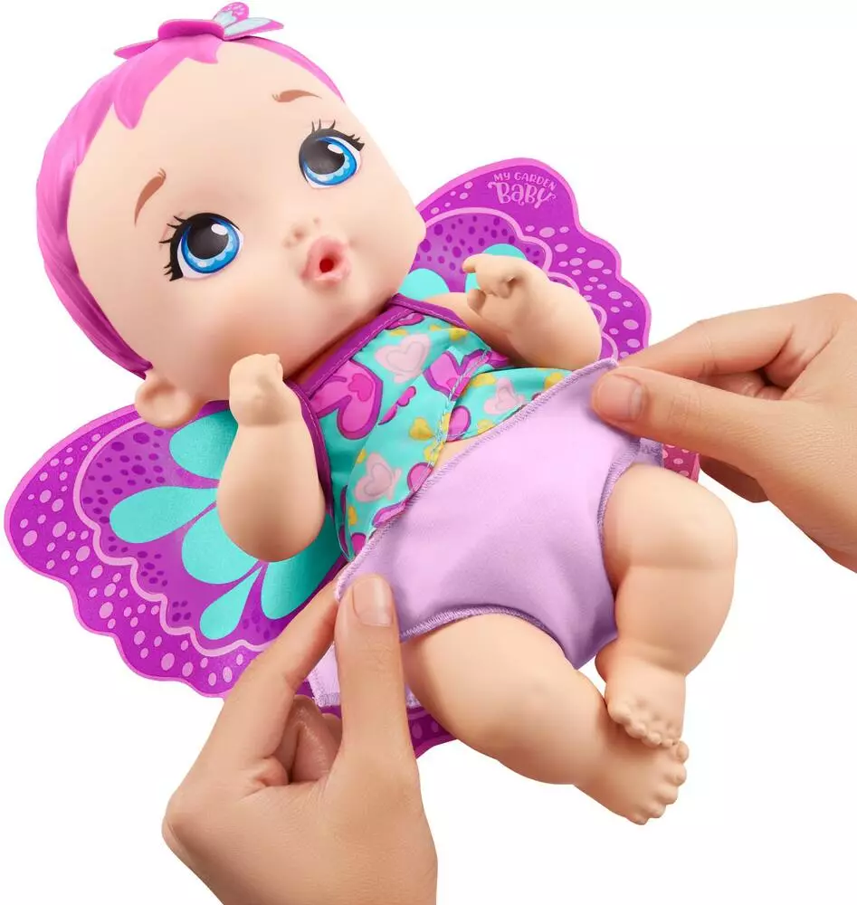 Cette poupée Bébé Papillon rose Boit et Fait Pipi de My Garden Baby de 30 cm a des ailes souples, des cheveux merveilleux et un doux parfum de jasmin. Remplissez le biberon lapin d’eau, donnez-lui à boire, puis changez sa couche en tissu réutilisable. Cette adorable enfant porte un haut amovible et possède un anneau de dentition ! Pour une sieste bien au chaud, détachez les ailes pour en faire une couverture. L’emballage se plie en forme de berceau.