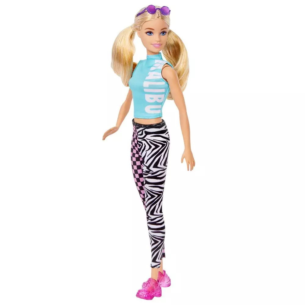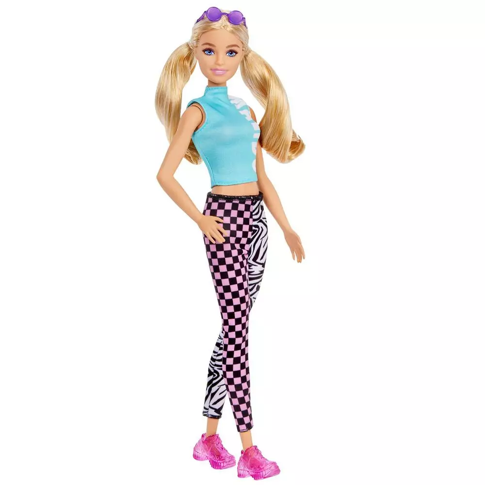 Cette jolie blonde adopte un look sportif et tendance avec son top court et son legging aux motifs à damier et zébrures. La silhouette de Barbie Fashionistas est de taille classique.