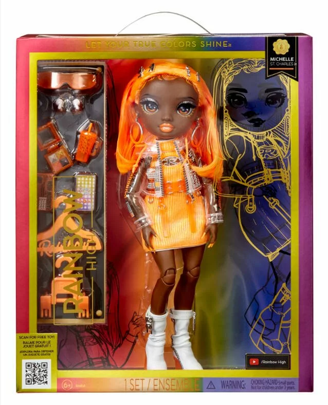 Poupée articulée avec 1 tenue, 1 paire de chaussures, 2 cintres, 1 peigne, 1 support et des accessoires.