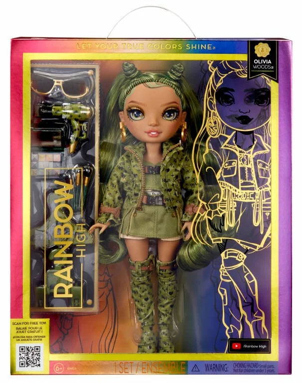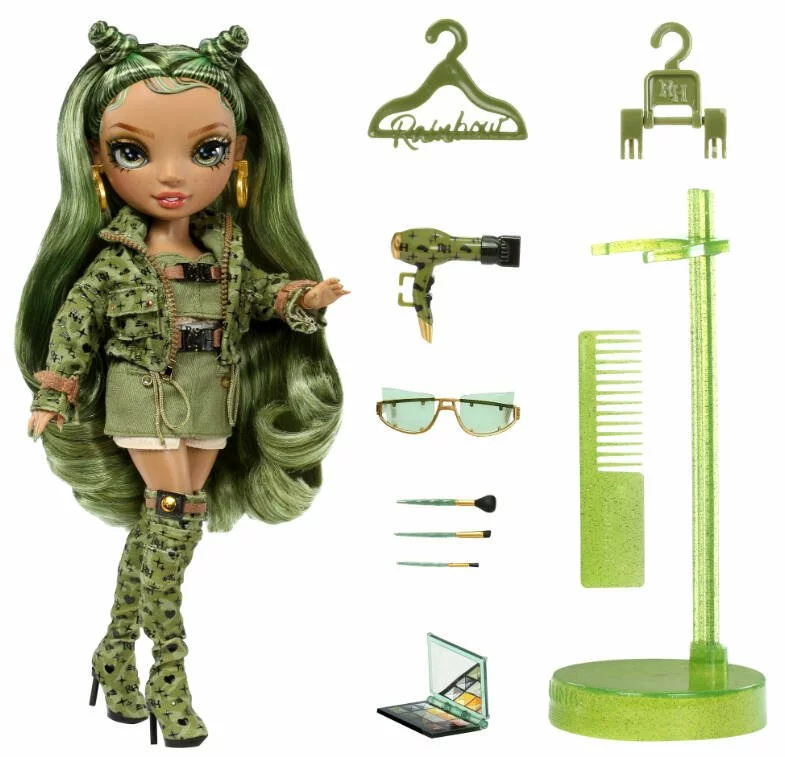 Poupée articulée avec 1 tenue, 1 paire de chaussures, 2 cintres, 1 peigne, 1 support et des accessoires.