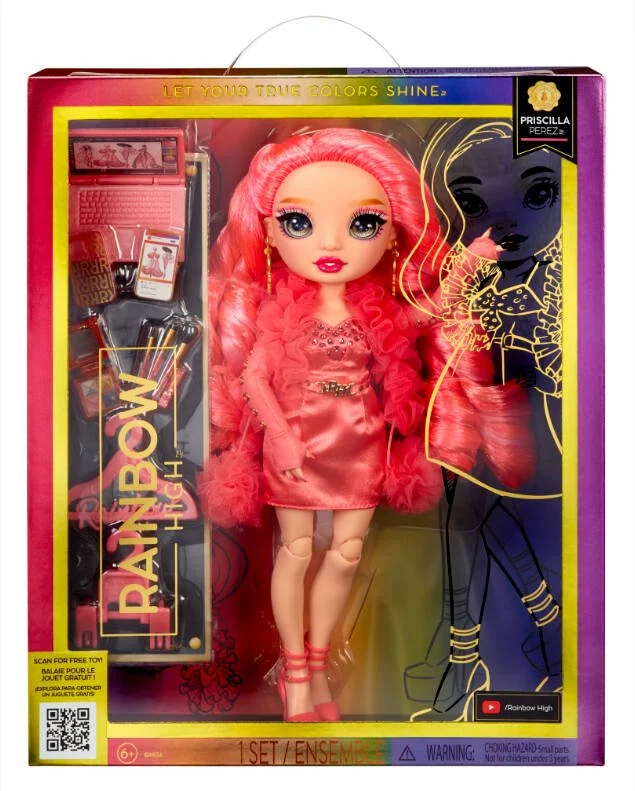 Poupée articulée avec 1 tenue, 1 paire de chaussures, 2 cintres, 1 peigne, 1 support et des accessoires.