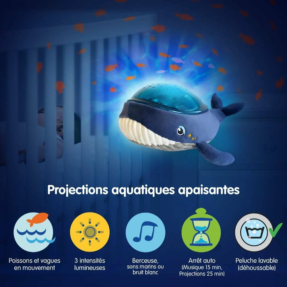 Aqua Dream est un projecteur d’effets aquatiques pour endormir votre enfant paisiblement. De merveilleuses projections sous-marines sont animées avec des poissons en mouvement. 3 intensités lumineuses permettent de créer l’ambiance parfaite pour Bébé. 2 mélodies des bruits blancs et arrêt automatique. Effet veilleuse et projection d’étoiles sur le ventre : une pression sur le ventre permet de changer la couleur de la lumière. Aqua Dream s’arrête tout seul grâce à son minuteur : Musique 15 min. Projections 25 minutes. Peluche musicale et lumineuse en velours extra doux. Lavable.