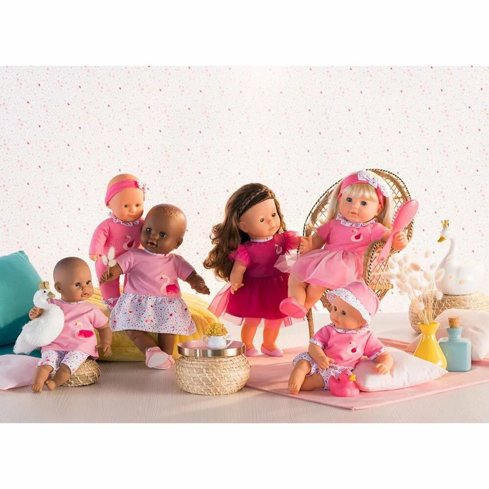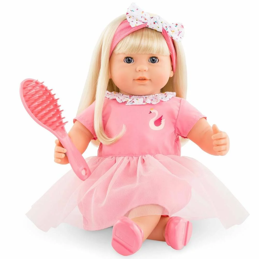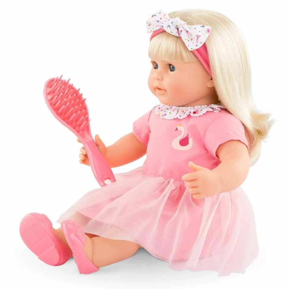 Adèle est un grand poupon Corolle pour jouer et faire comme les grands. Avec les longs cheveux faciles à coiffer et la brosse de son poupon, l’enfant imagine et réalise ses toutes premières coiffures ! Adèle mesure 36 cm, une taille parfaitement adaptée aux petits bras de l’enfant pour la câliner, la materner et reproduire les gestes qui font devenir grand. Son visage, ses bras et ses jambes, à la délicate senteur de vanille, sont en vinyle doux au toucher. Son corps est souple pour faciliter ses mouvements et elle tient assise. Son pouce peut se maintenir dans sa bouche. Avec ses yeux dormeurs, elle fait dodo quand on la couche sur le dos. Elle est habillée d’une robe, coiffée d’un bandeau et chaussée d’une paire de ballerines.