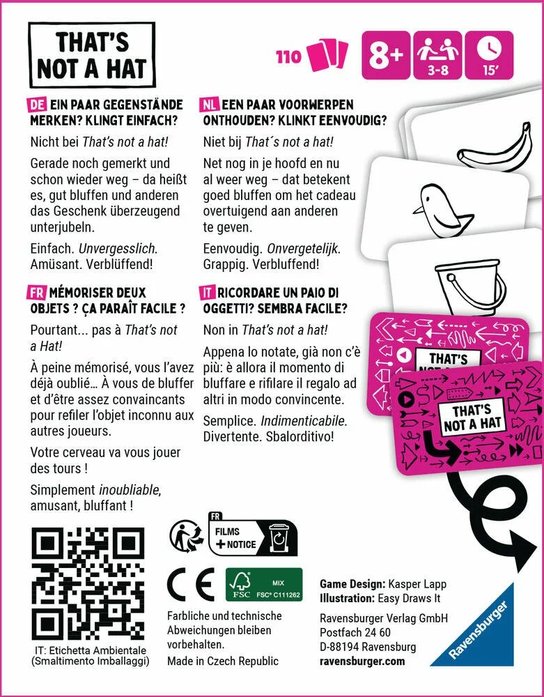 That’s not a Hat est un jeu familial qui fera rire toutes les générations de la famille. Mémorisez les cadeaux en jeu et offrez-les vous… Mais attention vos voisins peuvent refuser votre cadeau et vous le renvoyer. Si vous vous ne souvenez plus du cadeau que vous offrez, bluffez bien ! That’s not a hat est un jeu dans lequel vous allez devoir retenir de plus en plus de carte… Si vous n’y parvenez pas soyez convaincant en bluffant vos voisins !