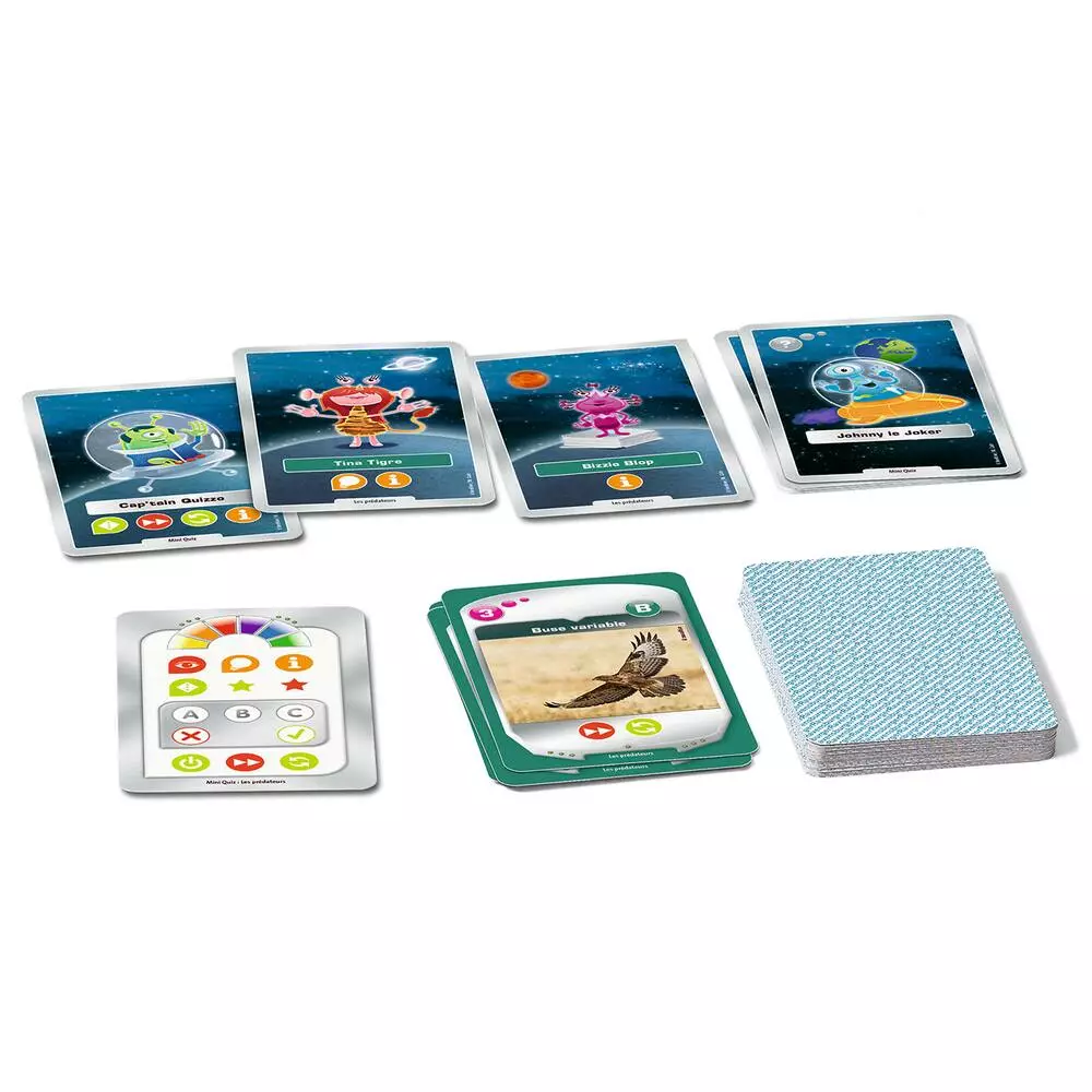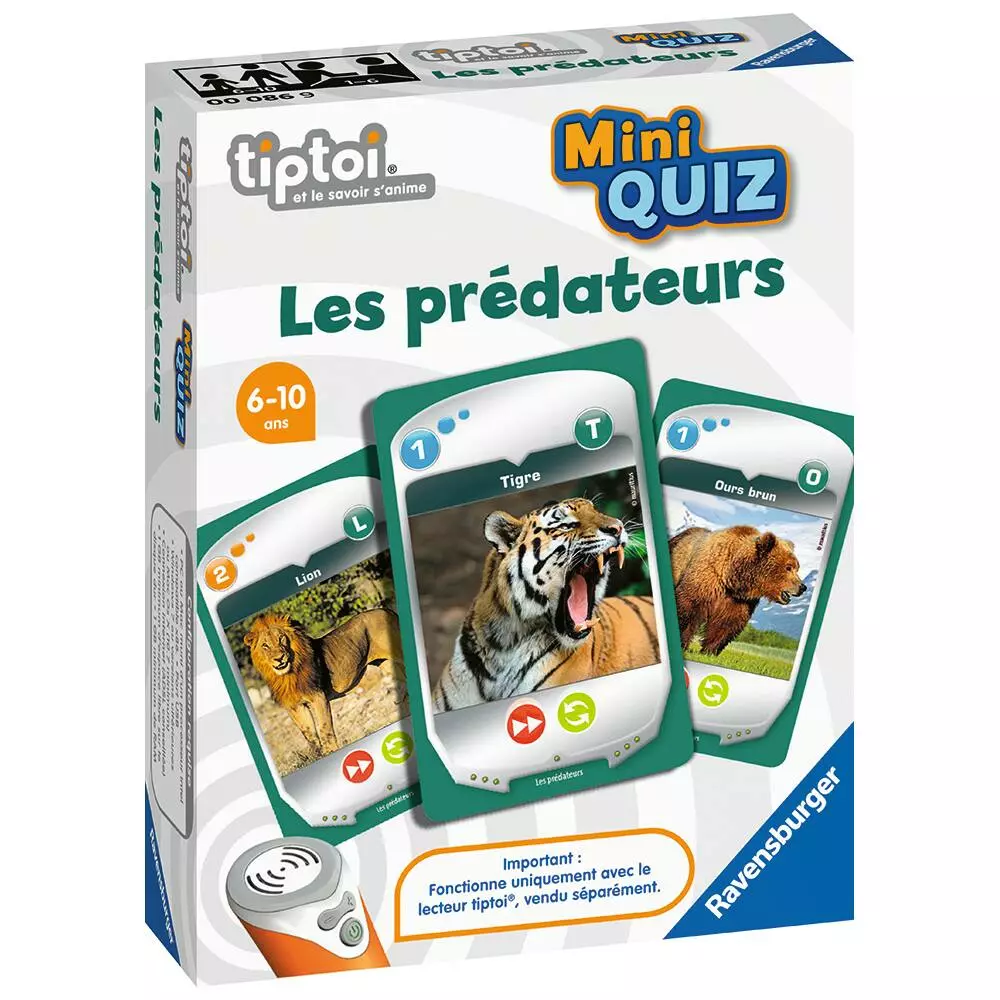 Les tigres savent-ils nager ? Quelle est la longueur d’un anaconda ? À quelle vitesse un guépard peut-il courir ? Découvre une mine d’informations sur les prédateurs avant de te lancer dans une trépidante partie de quiz. 3 en 1 : connaissances, quiz et jeu de cartes. Toutes les cartes de la collection Mini quiz peuvent en outre se combiner pour le quiz. Lecteur tiptoi® non inclus, vendu séparément.