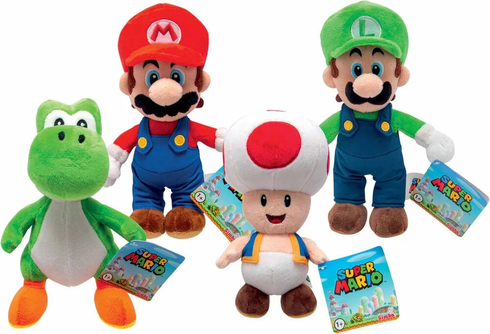 Super Mario Bros peluche de 20 cm. 4 modèles assortis : Mario, Luigi, Yoshi et Toad. Collectionne-les toutes ! 100% polyester. Lavage à la main. Séchage sur fil. Licence : Nintendo Super Mario Bros.