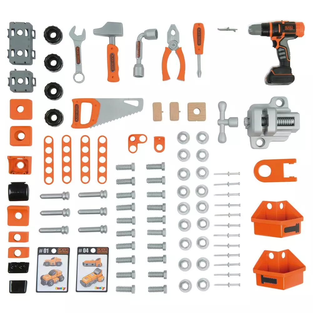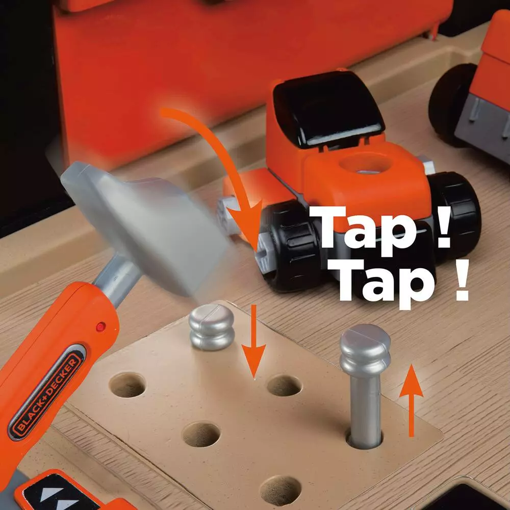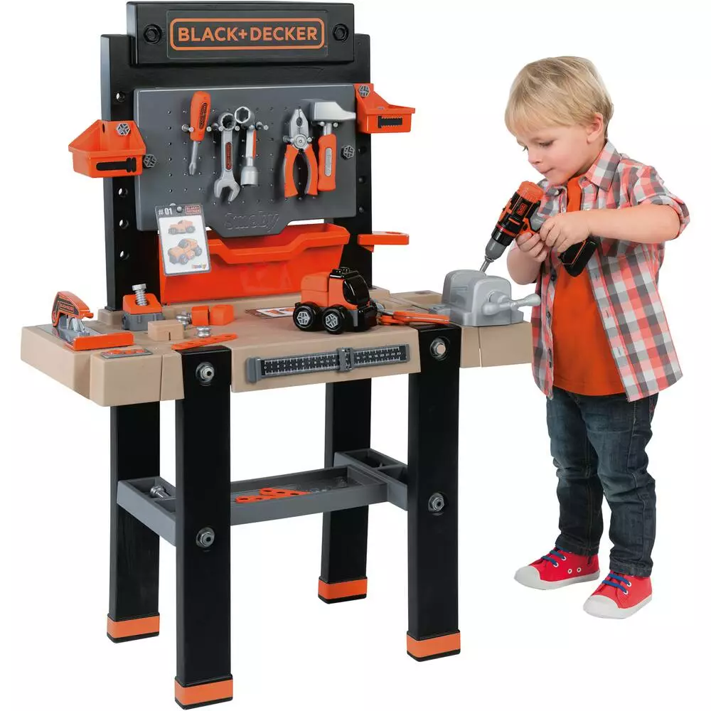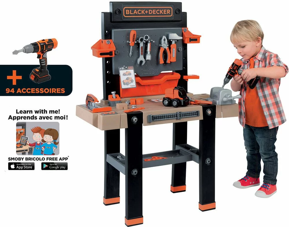 Superbe établi au design très contemporain et robuste. Son plateau imitation bois, ses outils, ses accessoires et ses fonctions de jeu feront jalouser les parents ! Idéal pour apprendre à bricoler, connaître l’utilisation des outils, construire des véhicules… Établi complet avec perceuse mécanique, scie électronique et 94 accessoires. Très ludique, la scie circulaire tourne vraiment et permet de couper des petites buchettes imitation bois ! Les sons de bricolage du module électronique rendent le produit très réaliste.