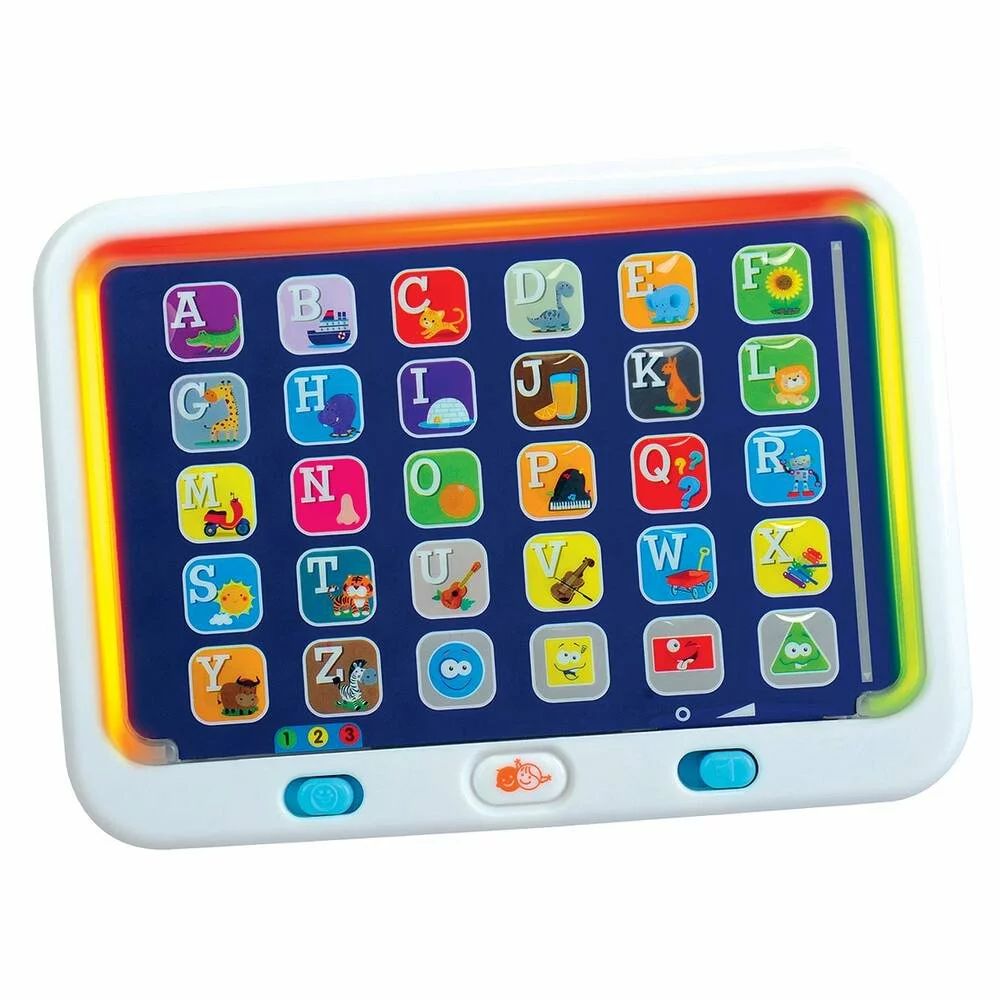 Tablette bilingue anglais français (via un bouton). Appuie sur les touches pour explorer de nouvelles couleurs et lettres, les premiers mots et plus encore ! 3 niveaux de jeu interactifs et divertissants pour dĂ©fier les petits esprits curieux. Niveau 1 Explorer : lettres et premiers mots ; les couleurs vives et la musique attireront l’attention de bĂ©bĂ©. Niveau 2 Apprendre et imiter : faites-lui dĂ©couvrir diffĂ©rents sons et phrases courtes ; stimulez son imagination et encouragez le dĂ©veloppement de la parole et de la langue. Niveau 3 Encourager : Ă©valuez la rapiditĂ© de son apprentissage et laissez-le progresser ; encouragez et mettez en valeur son apprentissage lorsqu’il est prĂŞt. Avec 30 boutons interactifs et plus de 205 chansons, mĂ©lodies, phrases et sons. Explore et apprends tout en jouant ! Encourage le dĂ©veloppement du langage, la coordination Ĺ“il-main et l’imagination. Fonction Try Me. 3 piles LR03 fournies. Bouton pour contrĂ´ler le volume sonore. Un bouton te permet de choisir le niveau de jeu (1,2,3).