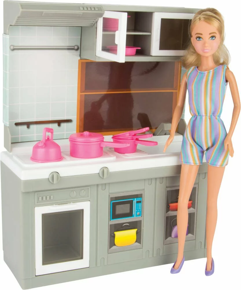 Poupée mannequin de 29 cm avec de nombreux accessoires. Contenu : 1 poupée, 1 tenue, 1 paire de chaussures, 1 cuisine assemblée, 12 ustensiles de cuisine, 14 pièces de vaisselle (fourchettes, couteaux, cuillères, tasses et assiettes), 4 aliments (boîtes de marchandises factices), 1 égouttoir, 1 plateau, 1 moule, 4 casseroles, 2 marmites et 1 théière. Instructions imprimées sur la boîte. Mode, sport ou voyage… Thaïs est la poupée tendance qui se révèle à travers ses passions.