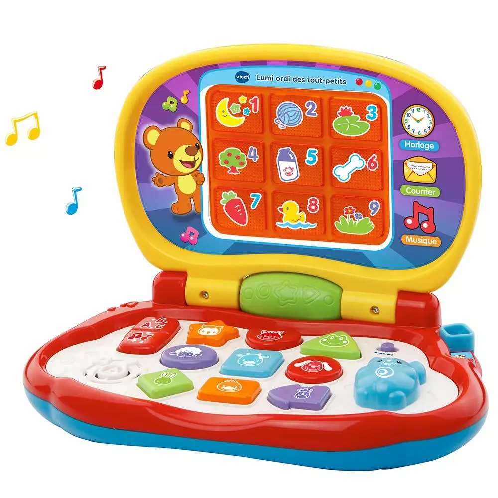 9 touches interactives pour découvrir les formes, les animaux et les couleurs. Avec une souris directionnelle pour imiter Papa et Maman, déclencher des sons rigolos et découvrir les chiffres. Des effets lumineux à l’écran attirent l’oeil de bébé, l’incitent à jouer et font comprendre les associations. 3 modes de jeu : Animaux, Formes, Musique. Une touche pour découvrir l’alphabet en chanson, avec une poignée pour transporer l’ordi partout. 20 mélodies et 3 chansons.
