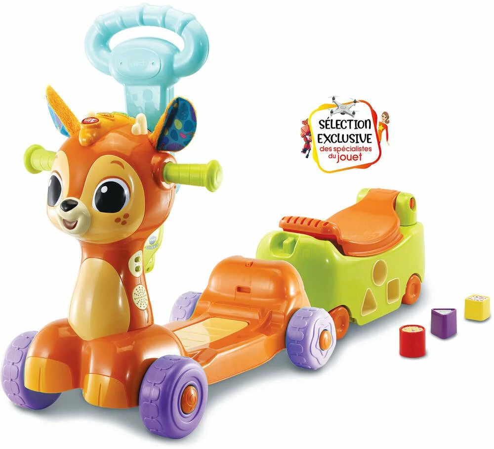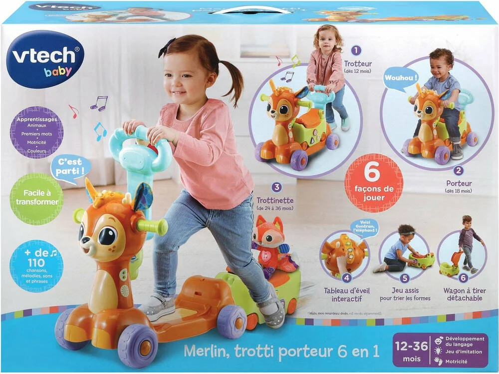 Un adorable trotteur-porteur 6 en 1 en forme de daim pour grandir avec Bébé. 6 configurations évolutives : Dès 12 mois, Bébé appréhende l’équilibre, se met debout et pousse son daim en mode trotteur – De 12 à 18 mois, Bébé s’assoit sur Merlin et pousse sur ses jambes pour avancer – Dès 18 mois, il s’élance et part à l’aventure en mode trottinette ! Bébé part à l’aventure avec son doudou ! Le wagon détachable peut se placer à l’arrière de la trottinette pour voyager en compagnie – Génial ! Bébé peut tirer le wagon détachable mais également encastrer les 4 formes incluses. – Un tableau d’éveil composé de 5 boutons lumineux pour apprendre les chiffres, les lettres et les couleurs ! Bébé développe son sens du toucher en manipulant les oreilles de Merlin faites en peluche et papier bruissant.
