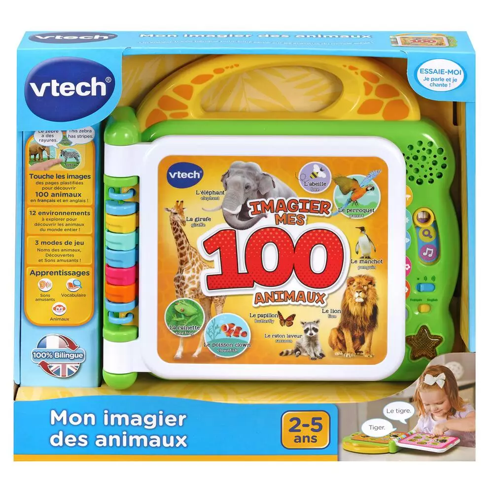 Mon imagier des animaux bilingue. De 1,5 Ă 4 ans. Cet imagier parlant et interactif permet de dĂ©couvrir 100 animaux en français et en anglais. Le livre comporte 12 pages Ă©ducatives plastifiĂ©es et illustrĂ©es avec capteurs sensitifs pour sĂ©lectionner les illustrations et faire de nombreuses dĂ©couvertes. Chaque page d’apprentissage est classĂ©e par thème : animaux de la ferme, de la savane, de la jungle… Avec photos et illustrations. 3 modes de jeu : Vocabulaire, DĂ©couvertes et Sons amusants. La poignĂ©e adaptĂ©e aux petits permet une prise en main facile. 2 chansons et des effets sonores amusants. 100 % bilingue (français / anglais) ! ArrĂŞt automatique.
