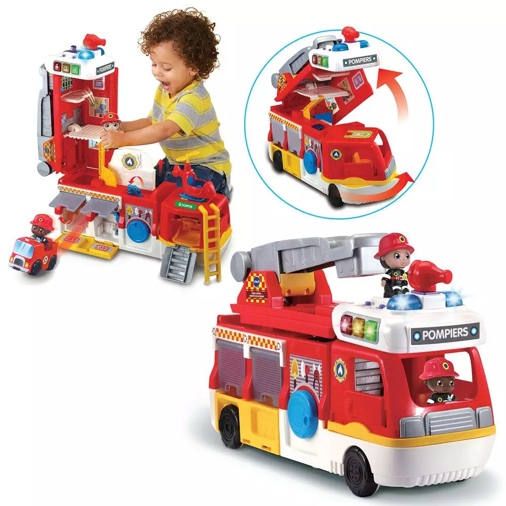 Tut Tut Copains. Super camion caserne de pompiers. De 1 à 5 ans. Un incendie s’est déclaré ! Vite, les Tut Tut Copains pompiers doivent aller l’éteindre ! Les deux Tut Tut Copains inclus peuvent être placés à l’avant pour conduire le camion. Ils sont reconnus et se mettent à parler grâce au rond magique. L’enfant fait avancer le camion grâce aux roues et déclenche chansons, mélodies et effet sonores réalistes. L’ échelle est orientable. Magique ! Le camion se transforme en caserne de pompiers. L’enfant découvre un garage avec un mini véhicule, une rampe pour faire montrer et descendre les pompiers et bien plus encore ! De nombreux éléments réalistes inclus pour développer la motricité (rampe d’incendie, drapeau, échelle, etc.). 3 modes de jeu : Musique, Découvertes et Missions
