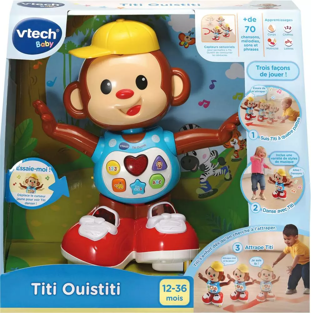 Un singe malicieux qui parle, chante, se déplace, tourne sur lui-même et s’échappe quand bébé approche ! 6 boutons et un cœur lumineux sur son corps pour découvrir les chiffres, les lettres, les couleurs,… Effets sonores et lumineux. Plus de 70 chansons, mélodies, sons et phrases.