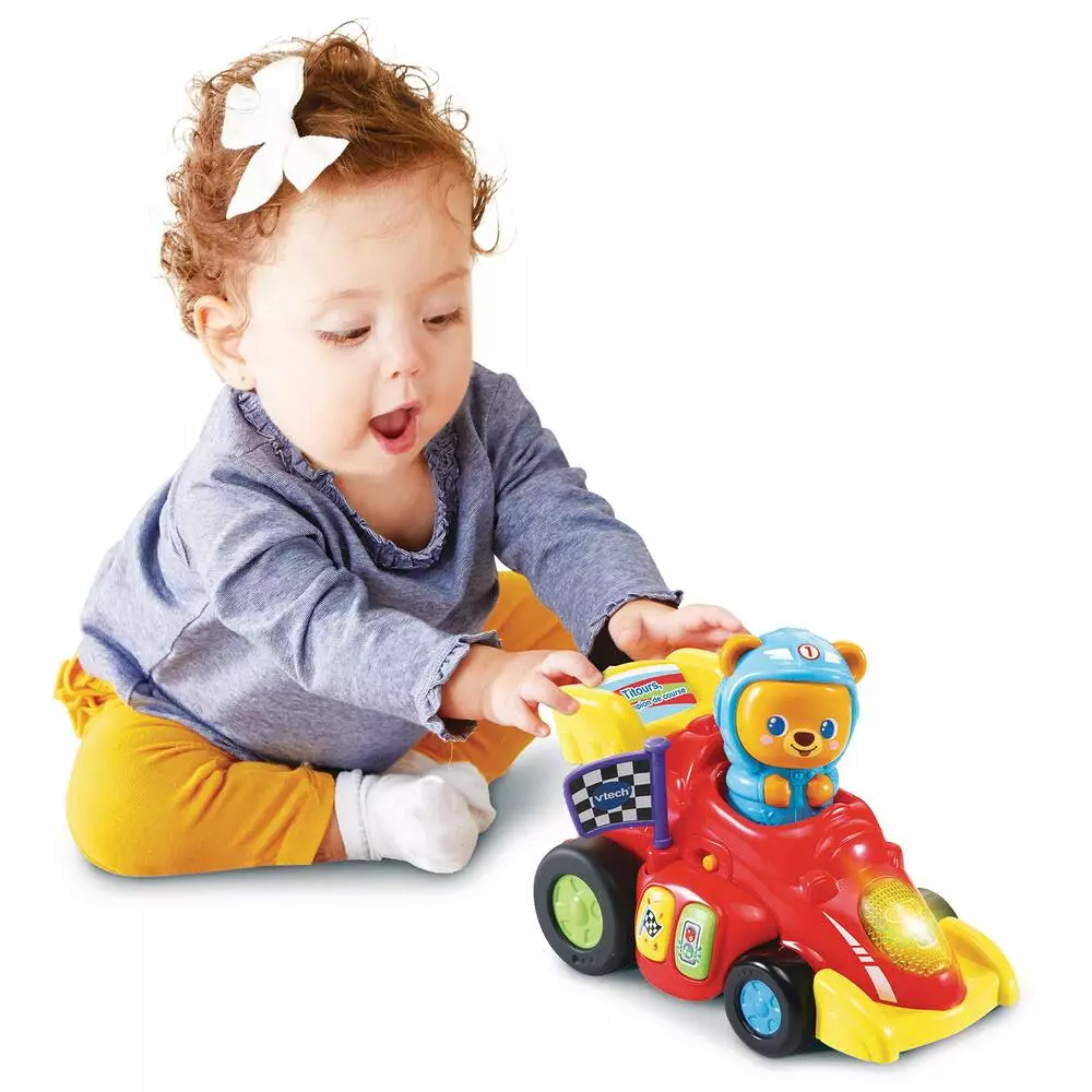 Titours champion de course. De 12 à 36 mois. Trop rigolo ! Quand Bébé appuie sur Titours, la voiture s’élance toute seule à toute vitesse ! Le bolide de course est aussi à rétro-friction ! Bébé le fait reculer pour le voir avancer tout seul. 2 boutons colorés pour apprendre les couleurs et écouter des anecdotes sur la course. De nombreux éléments à manipuler pour développer la motricité de Bébé. Le capot s’illumine au rythme des sons. + de 45 chansons, mélodies, sons et phrases. Arrêt automatique