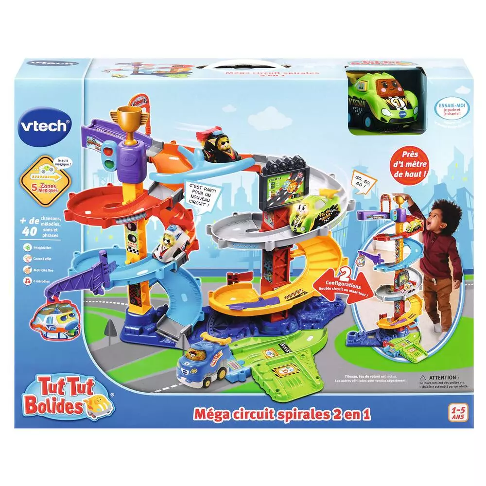 Tut Tut Bolides. Méga circuit spirales 2 en 1. De 1 – 5 ans. 2 configurations de pistes pour plus de jouabilité pour jouer assis ou debout. MODE COURSE En mode course, l’enfant place les véhicules sur le lanceur, appuie sur la coupe pour les faire descendre seuls. Super ! L’aiguillage s’enclenche automatiquement pour faire prendre des chemins différents aux bolides. MODE DESCENTE VERTIGINEUSE En mode descente, l’enfant appuie sur le feu tricolore pour faire descendre les véhicules. Trop rigolo ! Des passages secrets permettent de descendre plus rapidement ! L’aiguillage permet aux bolides d’arriver soit à la pompe à essence soit dehors. 92 cm de hauteur ! Amusant ! L’hélicoptère bouge lorsque la voiture tape sur l’affiche.Des pistes bosselées incluses pour pimenter la course ! 1 Tut Tut Bolides surprise inclus : Titouan fou du volant, 5 Zones Magiques, 3 chansons et 6 mélodies.