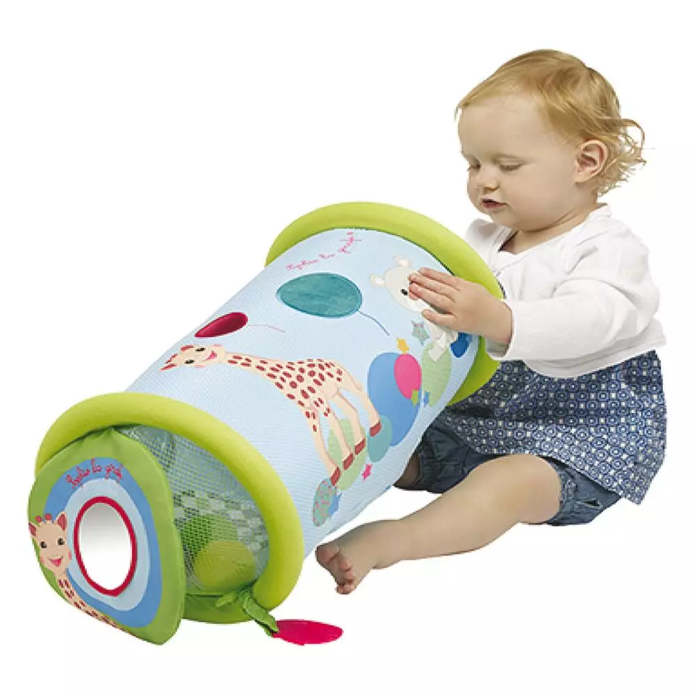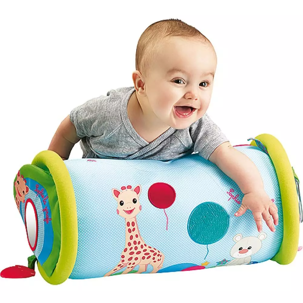 Un rouleau à escalader, à faire rouler et à chevaucher. Sa structure gonflable recouverte de tissu apporte confort, douceur et sécurité. Plusieurs activités à découvrir, pour développer les 5 sens de bébé : un miroir et des contrastes noir/blanc pour stimuler la vue; des balles sonores à l’intérieur du rouleau à faire rebondir, du papier froissé intégré dans la housse, un bruiteur caché dans Kiwi l’oiseau, pour stimuler l’ouïe; un anneau texturé à mordiller, pour soulager les poussées dentaires; des textures et matières variées et un filet à soulever afin d’éveiller la curiosité de bébé. Très léger et rapide à gonfler, le Rollin’Sophie se transporte facilement. Pratique ! La housse est amovible et lavable.