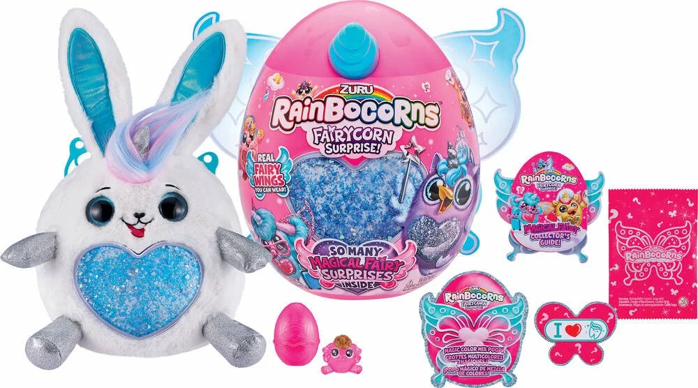 Œuf surprise géant Rainbocorns avec peluche et 10 surprises. Contient 1 peluche fée et des surprises magiques dont 1 paire d’ailes pour enfant.